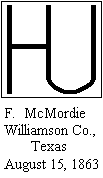 Francis McMordie, the eldest son of Hans and Martha Eskridge Kenner McMordie, was born 14 June 1832 on the family farm in Montgomery County, Tennessee (McMordie Bible, 1903; Census of Tennessee, #733, 1850).  Francis (Frank) moved with his family from Montgomery County, Tennessee, to Williamson County, Texas in 1853 (Montgomery County Deed Book 1, 1853).  He was made a Mason in the old Round Rock Lodge No. 227 in 1854, of which he was Worshipful Master 1869 - 1870, 1873 (McMordie, W., 1962: Thompson & DiGesualdo, 1985).  Frank married Mary Louise McGuire on February 24, 1857 in the Cumberland Presbyterian Church in Round Rock, Texas (Williamson County, Marriage Book, 1857).  The children of this marriage were: